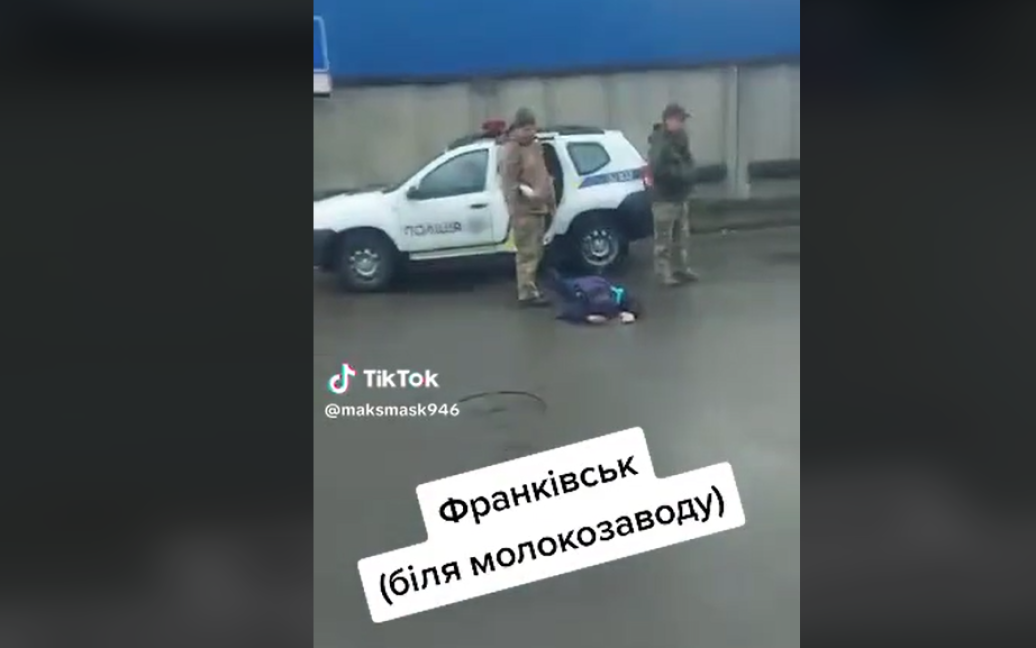 У Мережі з’явилося відео, як в Івано-Франківську чоловік лежить на асфальті долілиць, а біля нього стоять двоє осіб у військовій формі.