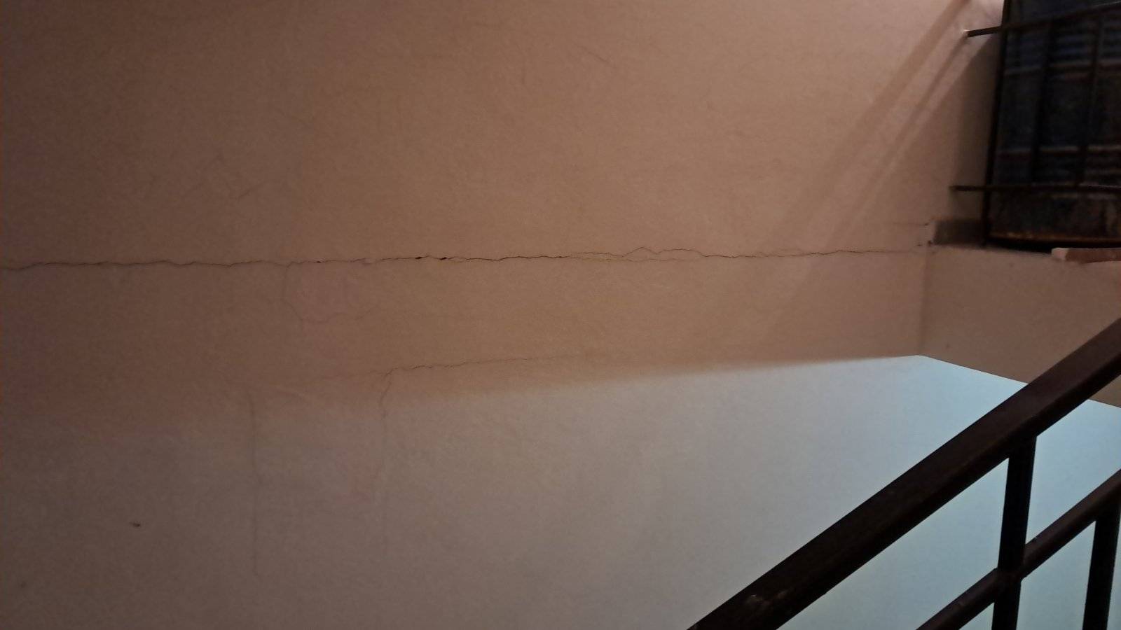 До журналістів звернулися мешканці цього двопід’їздного житлового будинку. Люди налякані й б’ють на сполох, адже від горища і до п’ятого поверху несучі стіни вкрилися рясними і глибокими тріщинами.