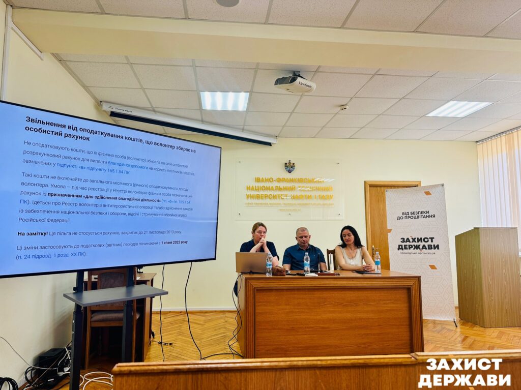 25 червня на базі Івано-Франківського національного технічного університету нафти і газу відбувся практичний семінар, організований ГО «Захист Держави». Темою зустрічі стали актуальні питання, з якими стикаються волонтерські та благодійні організації: оформлення гуманітарної допомоги, передача автомобілів для ЗСУ, збереження неприбуткового статусу та уникнення штрафів.