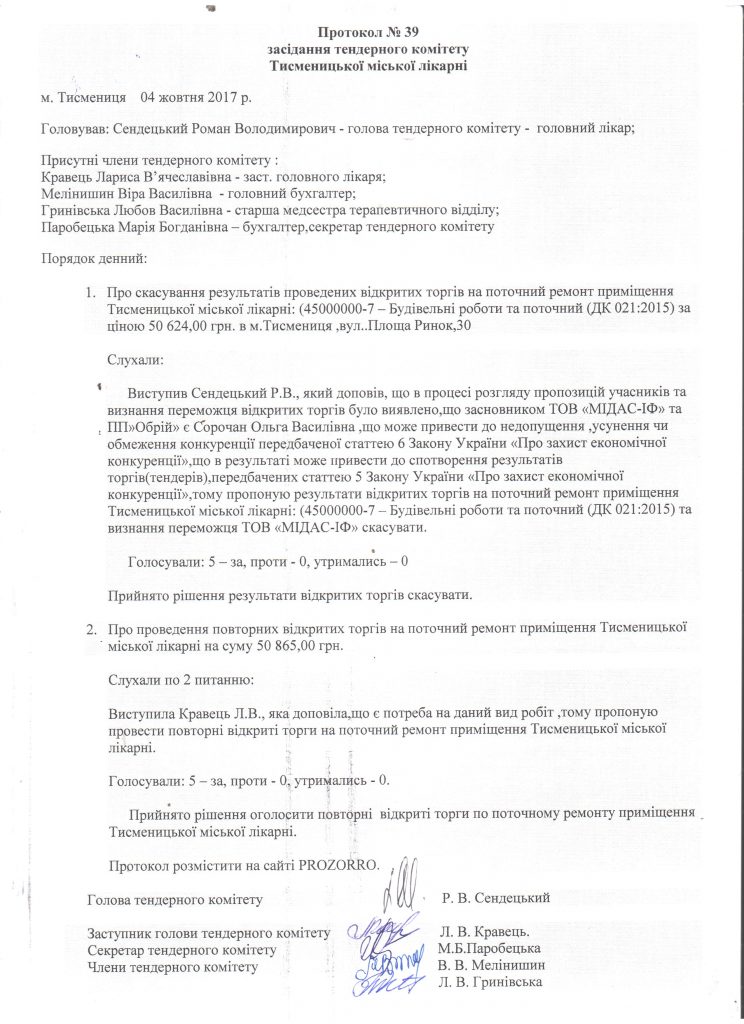 До слова, ПП «Обрій-ІВ» та ТОВ “МІДАС-ІФ” двічі були учасниками одного і того ж тендеру. В результаті торги на поточний ремонт приміщення Тисменицької міської лікарні були відмінені за порушення закону “Про захист економічної конкуренції”.