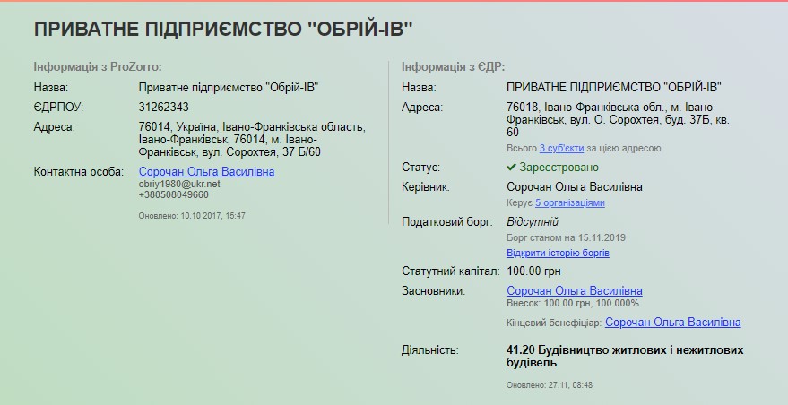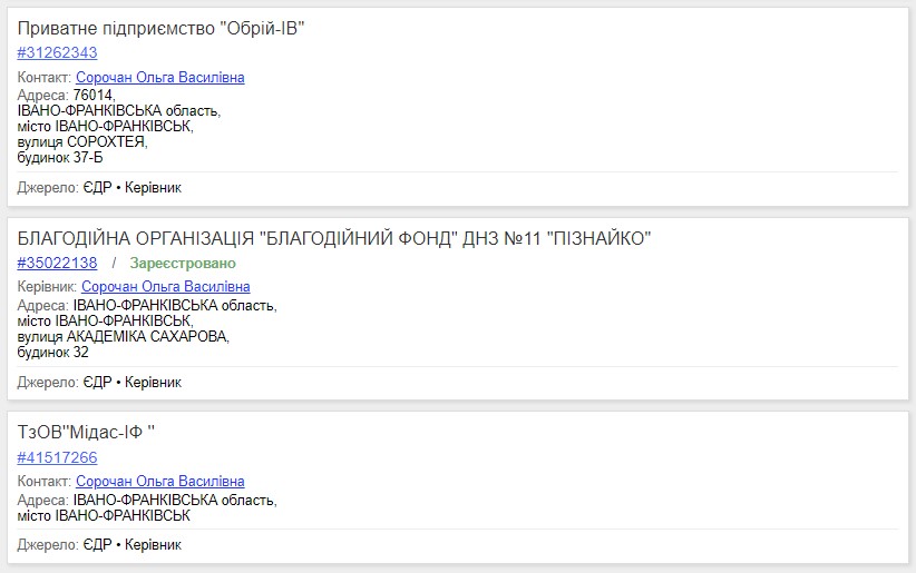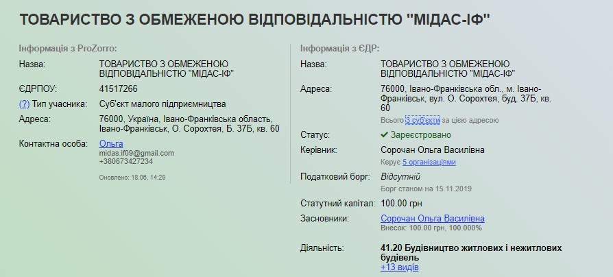 Також Ольга Сорочан є керівником фірми “МІДАС-ІФ”. Компанія зареєстрована за тією з адресою – в житловій квартирі на Сорохтея, з тим же статутним капіталом 100 гривень і також займається будівництвом житлових і нежитлових будівель.