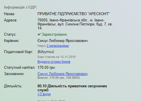 Щодо компанії «Аресконт», то вона заснована у вересні 2004 року. Також зареєстрована у житловій квартирі на вулиці Петлюри в Івано-Фрагківську. Статутний капітал – 170 гривень. Основний вид діяльності – діяльність приватних охоронних служб.