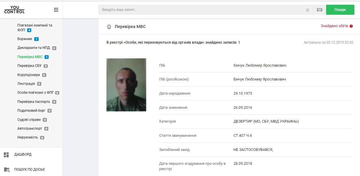 У його профайлі на порталі YouControl та сайті Миротворець вказано, що Любомир Ємчук занесений до реєстру «Особи, які переховуються від органів влади» за дезертирство.