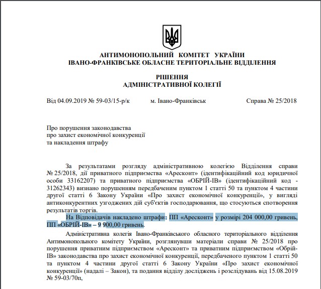 За змову у закупівлях Адміністративна колегія Івано-Франківського обласного територіального відділення Антимонопольного комітету України наклала штраф: ПП «Аресконт» у розмірі 204 000 гривень, ПП «ОБРІЙ-ІВ» – 9 900 гривень.