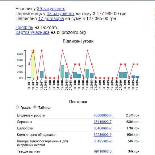 Незважаючи на явні фактори ризикута перебування компанії у чорному списку АМКУ, за останні два роки “МІДАС-ІФ” була учасником у 39 закупівлях, стала переможцем у 18 з них та підписала 17 договорів на загальну суму 3 127 365.00 гривень.