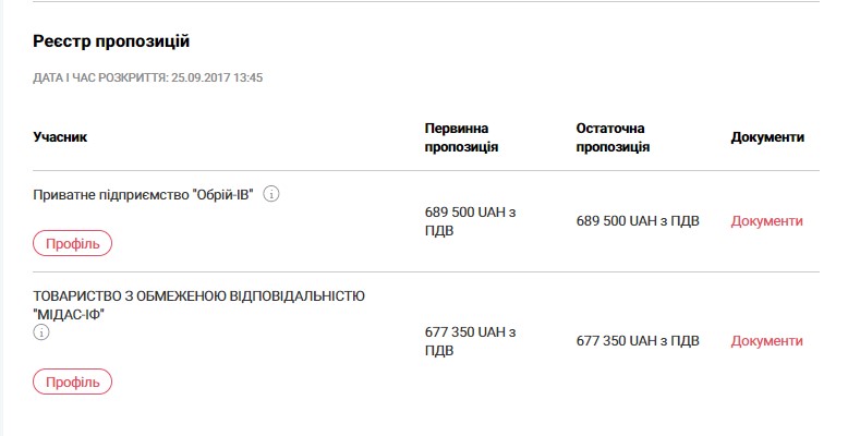 ПП «Обрій-ІВ» брало 5 разів участь у торгах, жодного разу переможцем не стало.