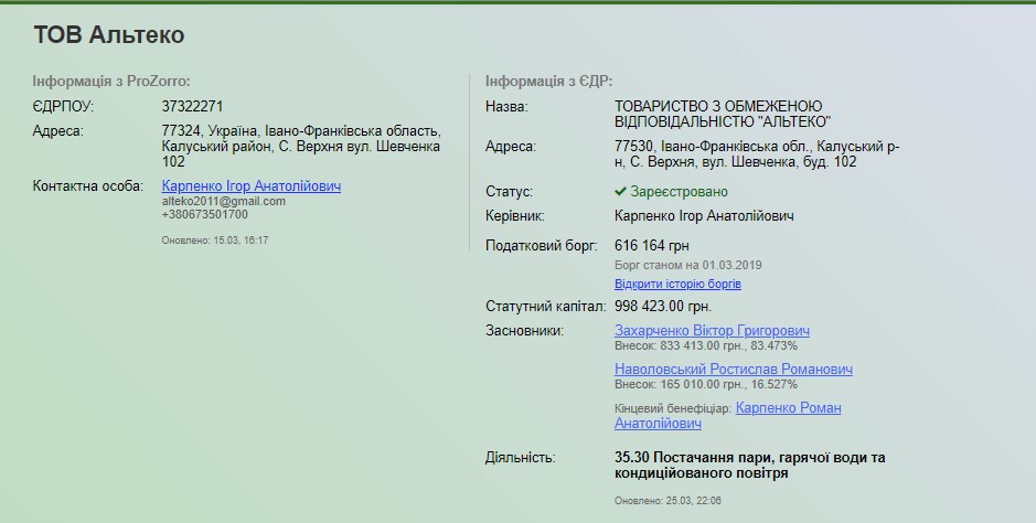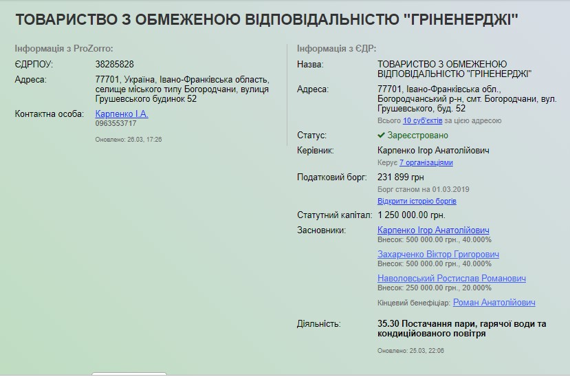 За даними пошуково-аналітичної платформи YouControl керівником “Альтеко” та “Гріненерджі” є Ігор Карпенко. Список власників також ідентичний – Захарченко Віктор Григорович, Наволовський Ростислав Романович та Карпенко Роман Анатолійович.