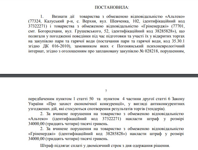 Зокрема, в червні 2016 року адмінколегія довела змову двох прикарпатських компаній ТОВ «Альтеко» та ТОВ «Гріненерджі» у відкритих торгах на закупівлю пари та гарячої води (постачання пари та гарячої води), замовником яких є Погонянський психоневрологічний інтернат.