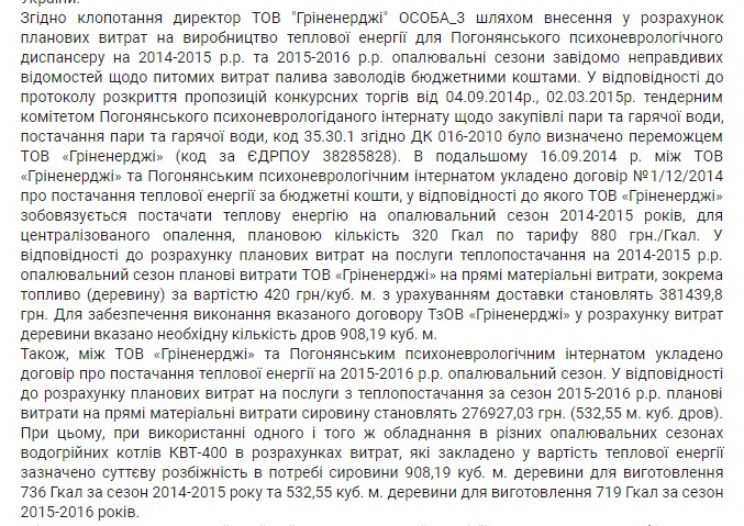 Директора ТОВ “Гріненерджі”, а він до слова той же, що і в “Альтеко”, підозрюють в заволодінні бюджетними коштами при внесенні завідомо неправдивих відомостей для розрахунку планових витрат на виробництво теплової енергії для Погонянського психоневрологічного диспансеру.